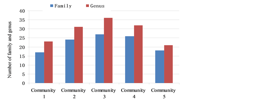 Figure 3 shows the number of families and genera in every community. In the two places, the number of families in community 1 of Yangmeikeng was one family less than that of community 5, and 9 families less than that of community 4 of Chiao. However, community 3 had a higher number of families than communities 4 and 5. The number of genera of community 1 was lower than that of community 4, while, in the two other communities, community 2 was one genus lower than community 4, but more than 10 genera higher than community 5. All values in community 3 were higher than those in communities 4 and 5.