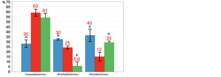 Figure 6. Comparison of order/family/genus taxonomic assignments using Silva, RDP and Greengenes database with VAMPS and MG- RAST online classifiers. (a) Firmicutes major genus: Enterococcus, Lactobacillus, Clostridiales, (b) Proteobacteria major subdivisions (c) Actinobacteria genus: Corynebacterium, Brachybacterium and Brevibacterium. (Blue bacitracin, red: control and green: copper- exchanged zeolite). Numbers in black represent the mean value obtained for the three 16S reference databases and the two classifiers while values in red represent the result obtained against our dedicated database. Significant differences are shown by * (between each treatment) (p < 0.05) and D (between our database and 3 others studied).