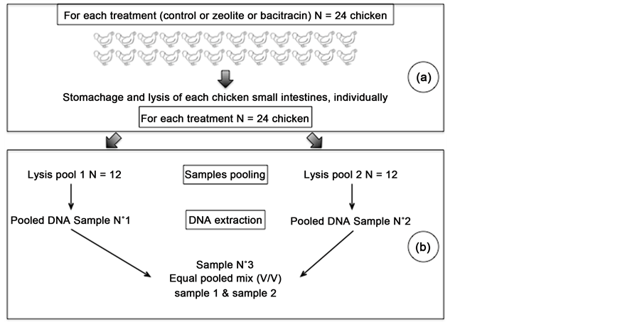 Figure S1. DNA sampling for microbiote analyses. Same protocol was used for each treatment (control, zeolite and bacitracin). Briefly, twenty four chicken small intestines were individually lysed and stomach (a). Then, two pools containing each 12 lysis products were used for DNA extraction, resulting in pooled DNA samples 1 and 2. Additionally, an equimolar mix of these two last samples was prepared, corresponding to equal pooled mix sample 3 (b).