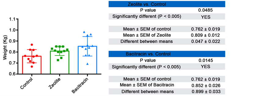 Figure 1. Graphs showing chicken body weight (BW) distribution as well as t-test results. Control in red circles, zeolte in green squares and bacitracin in blue triangles.