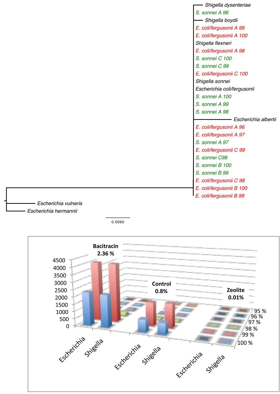 Escherichia was previously reported to be more prevalent in small intestine of chickens that consumed zinc bacitracin [75] , which supports our observation. Indeed, the antibiotic treatment increased a community of Proteobacteria indistinctly identi- fiedas Shigella and/or Escherichia species.