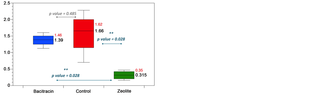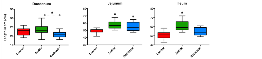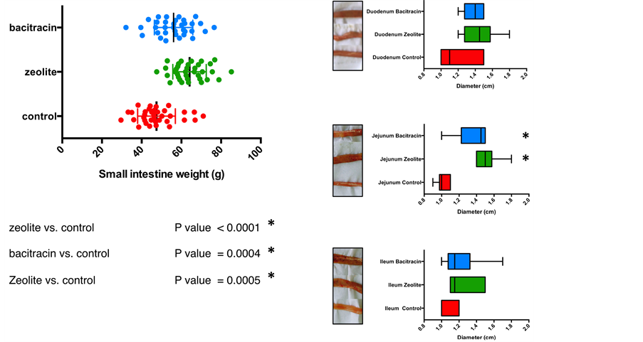 Copper-exchanged zeolite and zinc bacitracin supplemented chickens had significantly increased small intestines length and weight when compared with the control group (Figure 2(a)). Interestingly, diameters of jejunum from birds that received the control diet were significantly smaller when compared with birds in those supplemented diets. We observed the same trend for ileum and duodenum segments although the differen- ces were not statistically significant (Figure 2(b)). Noticeably, the addition of copper-