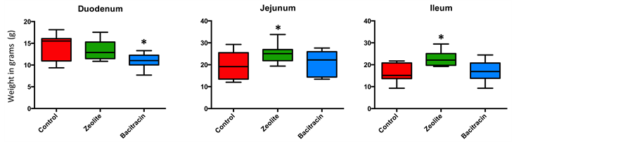 exchanged zeolite to the diet resulted in a significantly higher weight and length of the jejunum and ileum when compared to both control and antibiotic treatments (Figure 3). The supernatant-fraction of stomached control small intestines were more viscous than those from supplemented groups, so much that pipetting was difficult for these samples, in accordance with previous description [33] .
