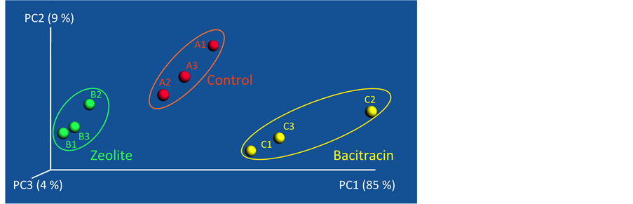 The PCoA plot showed a good clustering of triplicate samples (control triplicates: A1, A2, A3, zeolite triplicates: B1, B2, B3 bacitracin triplicates: C1, C2 C3) collected from each dietary treatment with a less defined clustering of bacitracin samples (Figure 4). This observation leads to the conclusion that both bacitracin and copper-exchanged zeolite influence the small intestine bacterial population and that the three bacterial populations are different. Interestingly and unexpectedly, the two supplemented diets (bacitracin and copper-exchanged zeolite), which lead to higher weights in the 36 individuals, have widely separated microbial populations.