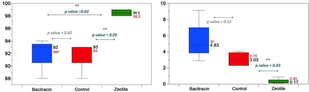 Final average body weight was 10 to 20% less than the genetic potential of the bird’s strain (http://en.aviagen.com/assets/Tech_Center/Ross_Broiler/Ross-PM3-Broiler-PO-2014-EN.pdf). Commercial performances are often 10% lower than the genetic potential due to non-ideal environment of farms. In this study, stocking density was the highest that can be found in European field conditions, in order to create room of improvement for the tested additives and make sure that growth of treated groups will be significantly improved compared to the control. As a consequence, the level of performance of birds is in coherence with expectations. Animal’s growth was not significantly different between copper-exchanged zeolite group and bacitracin group, and both groups were significantly heavier than the control group. Moreover, copper-exchanged zeolite seemed to enable a more homogeneous population than the 2 other groups. Anyway, these statements have to be taken with care since average weight and standard deviation were measured on birds, avoiding the extreme individuals. Therefore, the zootechnical conclusions may not be extrapolated to the whole population. Anyway, the study was designed to provide intestinal samples of animals that had significantly different weights, due to the addition of growth promoters in their diet, and this objective was achieved.