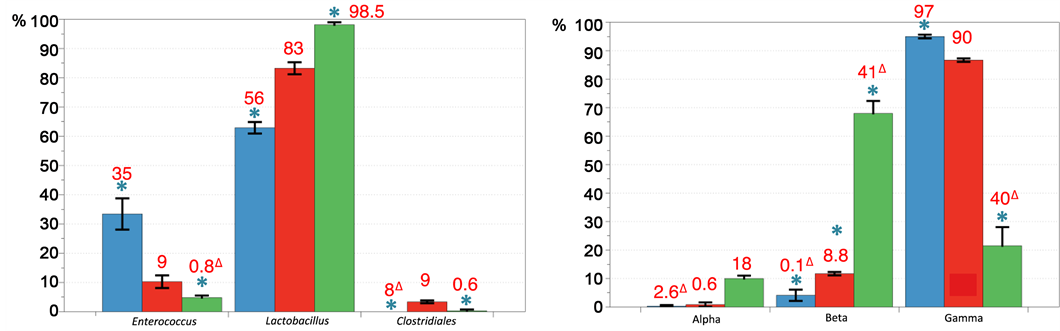 For the 9 preponderant order/families/genus that summarize the three microbiota studied (Figure 7), we first checked if species could be unambiguously differentiated using the 16S rRNA V3-V4 region. Concerning the Lactobacillus, the three majority species (L. johnsonii, L. reuteri and L. gasseri) have very similar sequences but are perfectly distinguishable as shown in the tree of distance regardless the identity percentage cut-off used (Figure S5). The vast majority of assignments were completed between 100% and 98% identity. For Streptococcus, all sequences were restricted to the S. bovis group [45] but species are hardly or not even separable (Figure S6). We obtained simi- lar results with the Enterococcus, all sequences belonging to the group of E. faecium, E.
