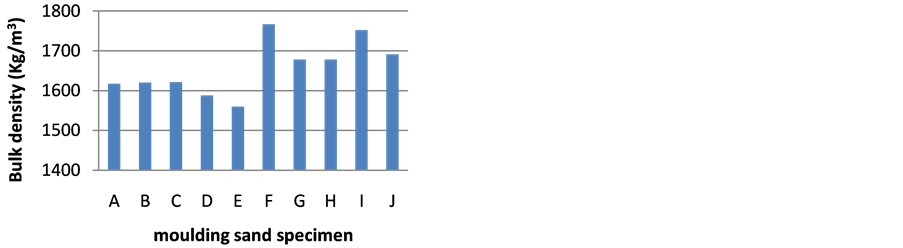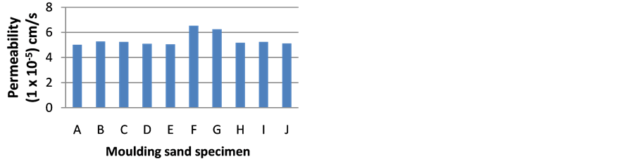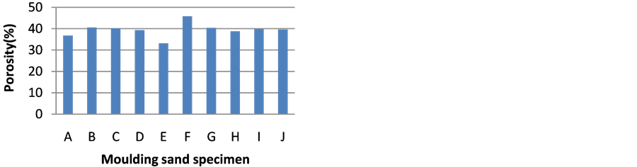 Permeability, porosity and bulk density are critical to the strength requirement of sand moulds [7] . Generally, the specimens’ permeability was observed to increase with increasing air filled porosity and decrease with bulk density [8] . Permeability is a function of the size of the sand particles, the amount and type of clay or bonding agent, the moisture content, and the compacting pressure [8] . In this study, variations in the moulding sand specimens’ permeability, porosity and bulk density characteristics were observed to be direct consequence of the specimens’ constituents. Relative improved permeability and porosity were obtained with charcoal dust containing moulding sand specimens as compared to iron filling and sawdust enriched specimens respectively. Specimen with 25% coal dust additive showed highest permeability and porosity values of 6.53 × 10−5 cm/s and 45.8% respectively, and the lowest values of 5.06 × 10−5 cm permeability and porosity 33.2% was revealed by specimen with 25% sawdust. High moisture content in the mould has been found to decrease with increasing porosity and permeability [1] . Hence, relative less casting defects may be obtained with moulding sand that is rich in coal dust. The bulk density characteristics obtained for all the additive aided moulding sand specimens were seen to vary slightly, but comparable with that of the moulding sand specimen (control) without additive. The results obtained indicated that the specimens’ bulk density characteristic was increased with increasing moisture content. At a very high moisture contents, maximum bulk density is achieved when the sand is adequately rammed to drive off all the air in the mould, and at low moisture contents, sand particles interfere with each other, such that addition of some moisture may be necessary for improved bulk density [1] .