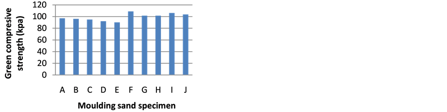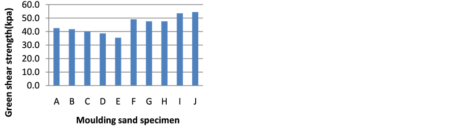 The relative improved green compressive and shear strength characteristics of the moulding sand specimens may have been influenced by the effects of the additives [9] . While the maximum green compressive strength value of 108.99 kPa developed in the moulding sand specimen with 25% sawdust additive may be due to better mould compaction resulting from better moisture absorbing strength of sawdust [3] , that of shear strength of value 54.49 kPa revealed by specimen with 25% sawdust, coal dust and iron filling may be due to synergic effects of the additives which includes good moulding sand compaction, better moisture absorbing characteristics