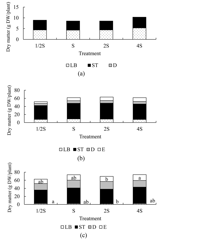 Figure 5. Dry matter of plant fractions in Eragrosis tef (teff) at several rates of fertilization (Exp. 2). Plant fraction: leaf blade (LB), stem including leaf sheath (ST), dead parts (D), ear (E). Bars with different letters were different between treatments at the 5% level. (a) 18 Aug. (b) 18 Sep. (c) 17 Oct.