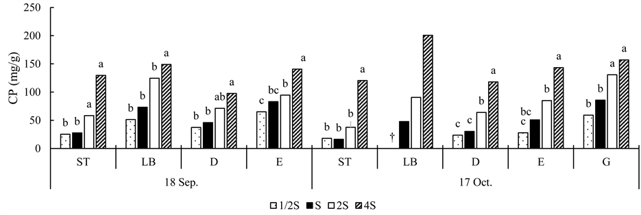 Hunter et al. (2007) [29] reported that the CP content of teff increased with an increase in fertilizer application, ranging from 120 to 170 mg∙g−1 under the optimum fertilizer application [22] . These CP contents of teff under the optimum fertilizer application was corresponded with the current results which showed that the CP content of teff in 4S treatment was recorded at the same levels, except for lower level in D obtained in September.