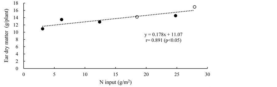 Figure 7. Relationship between nitrogen (N) input and ear dry matter in both Exp. 1 and Exp. 2. Data: Exp. 1(○), Exp. 2 (●).