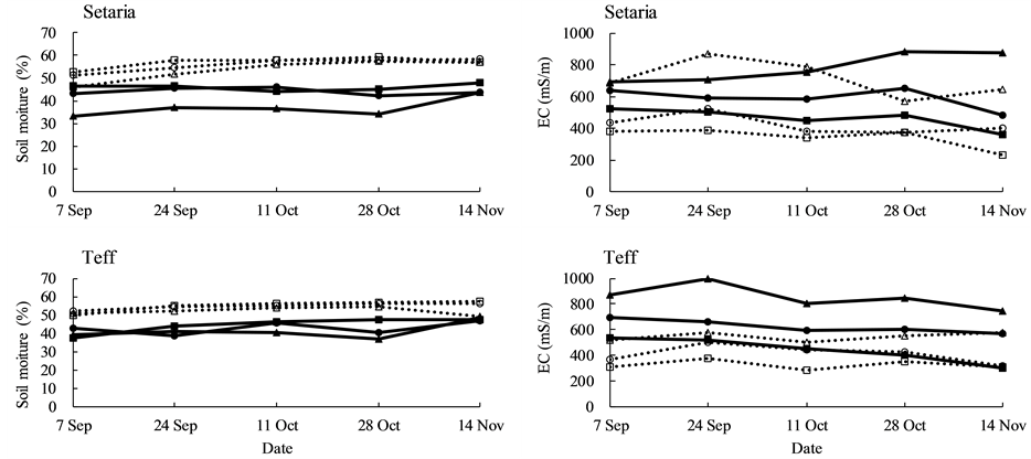 Soil moisture content and soil electrical conductivity (EC) were measured every other week by a soil moisture meter (Moisture Meter type HH2, Delta-T Devices, Cambridge, United Kingdom), which was inserted at a soil level of −10 cm. Soil organic matter (OM) content was measured on air-dried soil passed through a 2 mm screen by an ignition loss method. Plants were measured for growth attributes such as plant height, plant length, leaf number, tiller number and SPAD index (SPAD 502 meter, Minolta, Osaka, Japan) two months after transplanting on 15 November 2012. Plants were cut at the soil level to measure fresh and dry weight of aboveground parts, and underground parts were sampled after washing with water. Aboveground and underground plant parts were ground to pass through a 1 mm screen and were analyzed for in vitro dry matter digestibility (IVDMD) [21] , total nitrogen (TN) and total carbon (TC). The harvest index of teff was determined by calculating ear dry matter weight divided by total dry matter weight × 100.