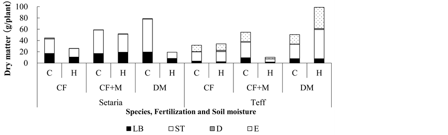 Figure 2. Dry matter of plant fractions in Setaria sphacelata (Setaria) and Eragrosis tef (teff) in several soil moisture and fertilization treatments (Exp.1). Plant fraction: leaf blade (LB), stem including leaf sheath (ST), dead parts (D), ear (E). Soil moisture: Control (C); high moisture (H); Fertilization: Chemical fertilizer (CF); chemical fertilizer plus manure (CF + M); doubled level of manure (DM).