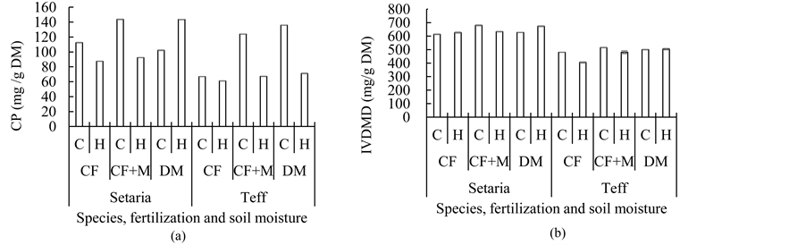 Figure 3. Crude protein (CP) content and in vitro dry matter digestibility (IVDMD) of Setaria sphacelata (Setaria) and Eragrosis tef (teff) in several soil moisture and fertilization treatments (Exp. 1). For details on fertilization, refer to the footnote for Figure 1.