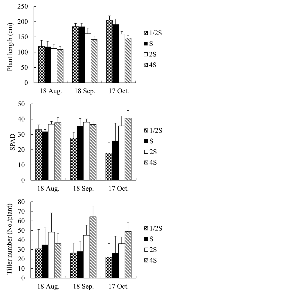 Plant length of teff tended to decrease with an increase in fertilizer application every month (Figure 4). Tiller number and SPAD index of teff increased with an increase in fertilizer application every month (Figure 4). The dry matter yield tended to increase with an increase in fertilizer application, while the difference among treatments was not significant in August or September. The growth rate of teff appeared larger from August to September than thereafter (Figure 5).