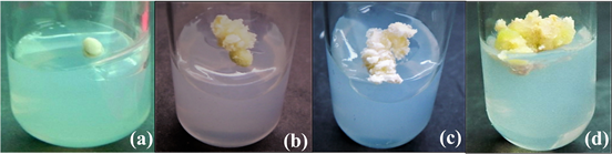 Figure 1. Callus induction from seed of native orange ((a) = initial stage of seed inoculation; (b) = initiation of callus; (c) = formation of callus; (d) = proliferation of callus).