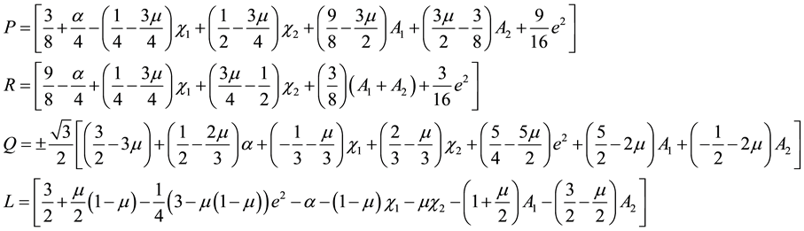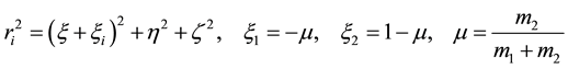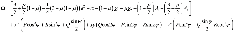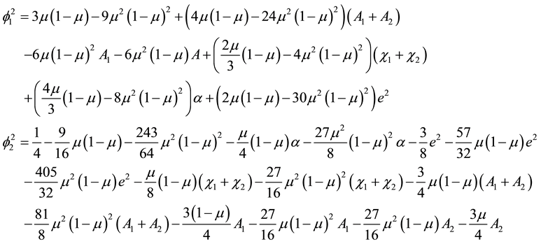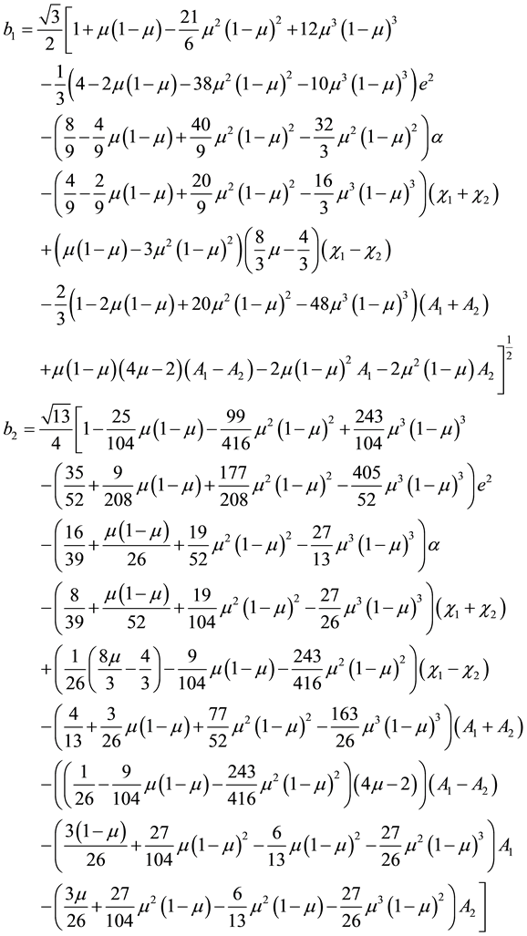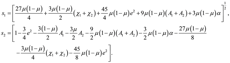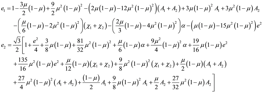 The orbits of most celestial and stellar bodies are elliptic rather than circular; as a result, the study of the elliptic restricted three-body problem (ER3BP) can have significant effects. When the primaries’ orbit is elliptic, a nonuniformly rotating-pulsating coordinate system is commonly used. These new coordinates have the felicitous property that, the positions of the primaries are fixed; however, the Hamiltonian is explicitly time-dependent [5] . Such an oscillating coordinate system has been introduced by using the variable distance between the primaries as a unit of length of the system by which distances are divided. Several studies [23] - [26] , [36] - [42] and [43] have examined the influence of the eccentricity of the orbits of the primary bodies with or without radiation pressure(s). Zimovshchikov and Tkhai [39] established the conditions of stability of the collinear and triangular points for various values of the eccentricity of the Keplerian orbits and the mass ratio of the primary bodies. Finally, Singh and Umar [23] - [26] considering both luminous primaries to be oblate spheroids as well investigated the existence of triangular, collinear and the out of plane equilibrium points in the ER3BP respectively.