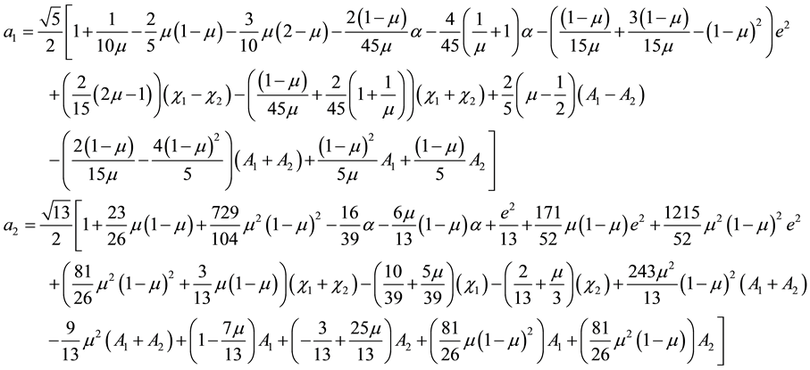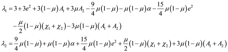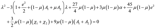 Table 2. Effect of the eccentricity of the primaries on the frequencies of the long and short periods, their eccentricities, semi- major and semi-minor axes and the roots of (10), for