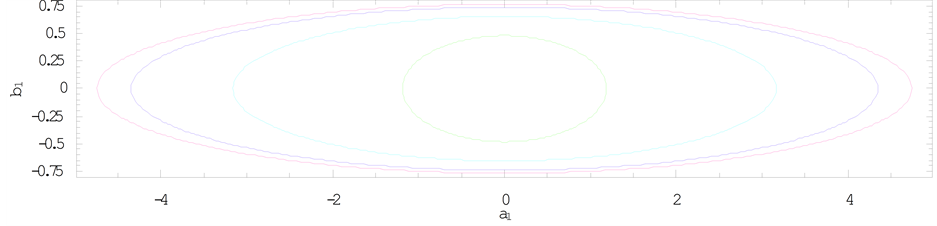 Table 1. Frequencies of the long and short periods, their eccentricities, semi-major and semi-minor axes for
