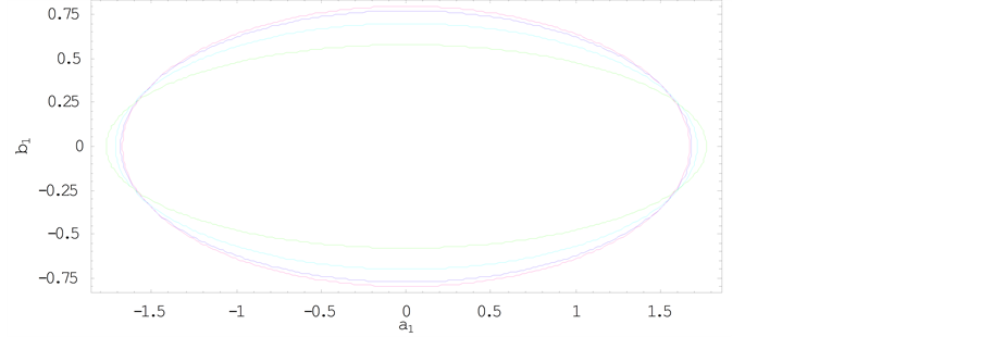 Figure 6. Effect of radiation of the bigger primary on the short periodic orbits for μ = 0.03; q2 = 0.8; A1 = 0.01; A2 = 0.02; e = 0.35 and a = 1.2.