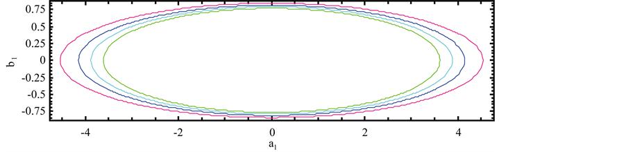 Figure 2. Effect of semi-major axis on the short periodic orbits for μ = 0.02; q1 = 0.9; q2 = 0.8; A1 = 0.01; A2 = 0.02 and e = 0.25.