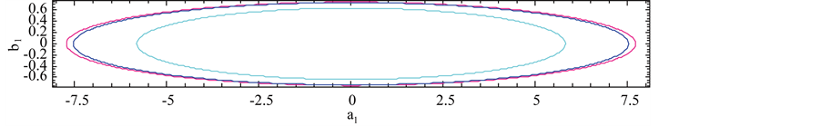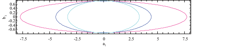 Figure 1. Effect of semi-major axis on the long periodic orbits for μ = 0.02; q1 = 0.9; q2 = 0.8; A1 = 0.01; A2 = 0.02 and e = 0.25.