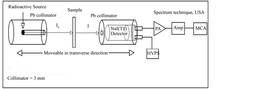 The diagram of experimental setup for mass attenuation coefficient determination is shown in Figure 1. The source and absorber system were mounted on a composite of adjustable stands. This setup can move in the transverse direction for proper beam alignment. The 137Cs and 22Na radioactive sources have activity of 5 mCi. The incident and transmitted gamma-rays intensities were measured for a fixed preset time in each experiment by recording the corresponding counts, using the 3'' × 3'' NaI (Tl) detector having an energy resolution of 7% at 662 keV (oxford model), with CANBERRA photomultiplier tube base model. The spectra were recorded using a CANBERRA PC-based multi-channel analyzer. In this experiment, the validity of the mass attenuation measurement was confirmed by measuring a lead slab.