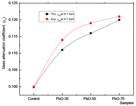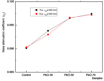 The experimental mass attenuation coefficients have been determined at the photon energies 511 keV and 662 KeV. Both experimental values and calculated values using computer code of XCOM of μ/ρ are displayed in Figure 2. It is clear that the mass attenuation coefficients decrease with the increase in photon energies. This may be attributed to the interaction mechanism of photons with the matter and it is differ for different photon energies [24] . Also it is observed that the mass attenuation coefficients of the investigated samples for all concentration of PbO are higher than that of Pb(NO3)2.