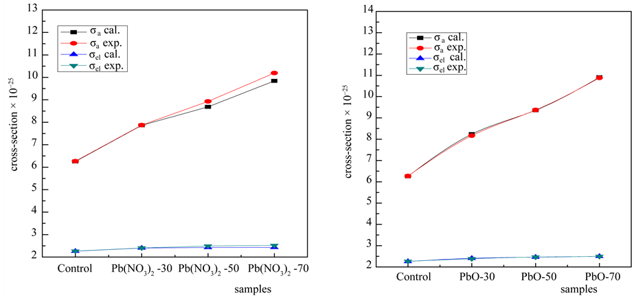 The total cross sections σ? and electronic cross sections sel have been calculated with respect to the experimental and calculated mass attenuation coefficients at energy 511 KeV and 662 KeV; the results given in the Figure 3 and Figure 4. The experimental values of total cross sections σ? and electronic cross sections sel are matched with the theoretical values. The small difference between the experimental and theoretical values might be from experimental setup, counting and efficiency errors in comparison to the calculated results of present work. The values of total cross sections sa and electronic cross sections sel for composite material contains lead oxide are more than composite material contains lead nitrate because the composite material contains lead oxide had a great contribution in various interaction with gamma-ray than composite material contains lead nitrate due to the weight fraction of Pb element is more in lead oxide than lead nitrate at the same weight. i.e the number of lead atoms in composite material contains lead oxide is more than in composite material contains lead nitrate. So electrons of lead in the last shell are fewer bands to the nucleus; this point increases the interaction probabilities for these atoms. The values of total cross sections σ? and electronic cross sections sel for all composite material at 511 KeV are higher than the values at 662 KeV may be due to the probability of absorption reduces with increasing incident photon energies.