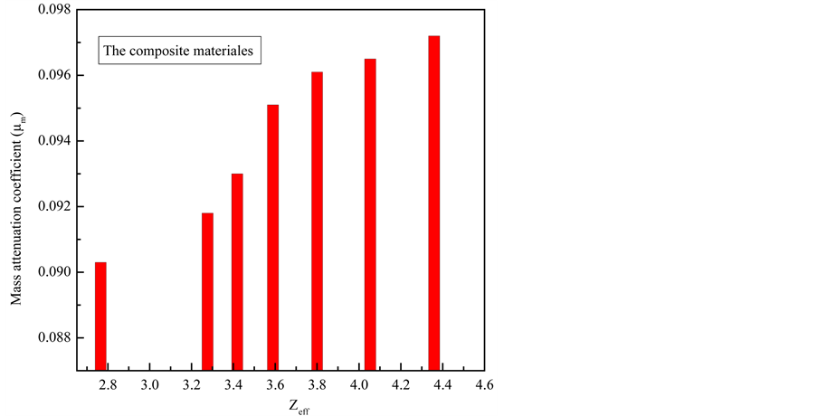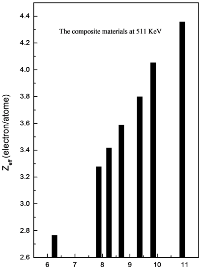The calculation of effective atomic number Zeff and electron density (Nel) becomes possible after finding the cross-section of the investigated samples Table 2. It is recognize that the effective atomic numbers is constant at different energies for all studied composite materials. This may be due to the dominance of photoelectric effect and Compton effect in their respective energy regions [1] [23] . Zeff value for a composite material is a very useful parameter for some applications such as physical, technological and engineering. Zeff represented with a number provides many characteristics of a material. Zeff value can provide estimation of the chemical composition of the material and it can be also utilized in the computation of absorbed dose in radiation therapy etc.