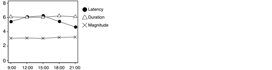 Figure 1. Latency, duration, and magnitude of vection according to the time of day. Duration and magnitude was divided by a value of 10.