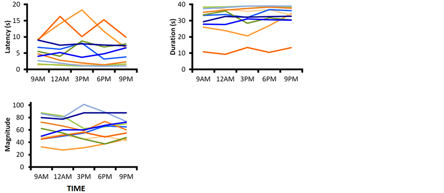Figure 2. Individual latency, duration, and magnitude of vection results according to time of day.