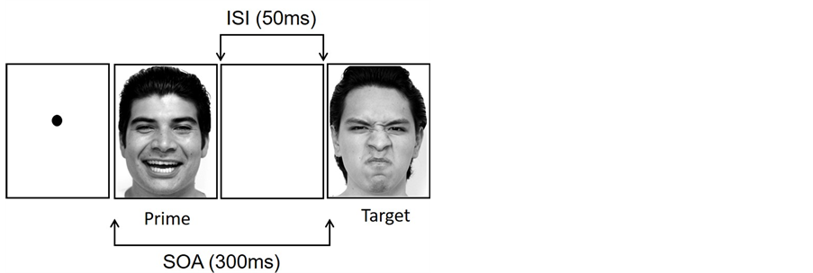 The selected affective prime face stimuli were arranged in pairs (prime-target) to create 135 experimental trials. Each trial presented the two faces consecutively, and stimulus onset asynchrony (SOA) was controlled (the time interval considering the beginning of the presentation of the first stimulus up to the beginning of the presentation of the second stimulus. In addition, the inter-stimulus interval (ISI; time between both stimuli) was controlled. Manipulation of the ISI and the SOA induces either cognitive automatic processing or controlled processing. In this study, both temporal parameters were set to activate automatic processing. The experimental trials were presented on a computer using the software Super Lab Pro 5. Figure 1 illustrates visually this experimental manipulation.