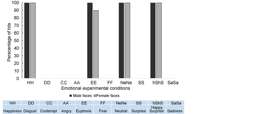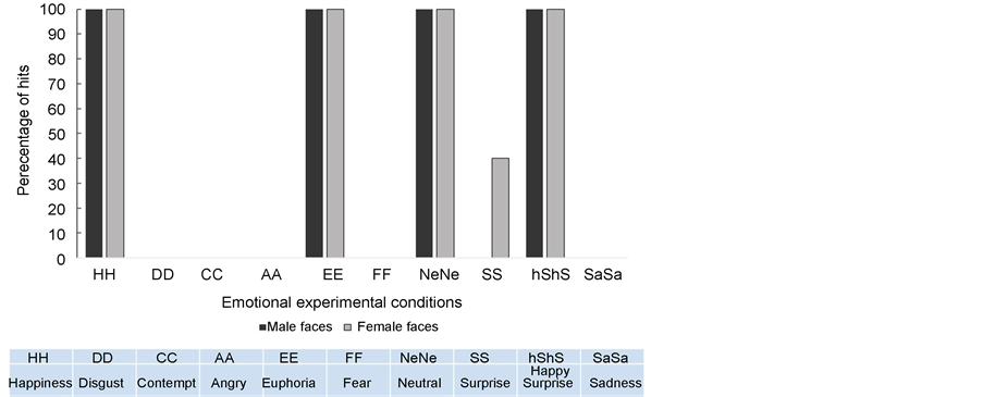 Also as expected, DS participants presented a recognition difficulty to negative facial information. Figure 3 shows the case for the DS female participant.