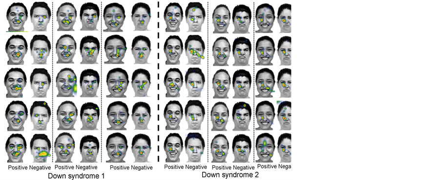 It is worth to notice that even when DS gaze patterns to positive and negative face information are atypical, they had no trouble recognizing positive face stimuli. Here, they seem to achieve positive face recognition by eye fixation over the upper lips area and nasolabial fold face information (see Figure 5 and Figure 6). Negative face recognition difficulties might not apply to the information recognition of happiness since physiology to both kind of emotions seems to be different (Blair, Morris, Frith, Perrett, & Dolan, 1999) .