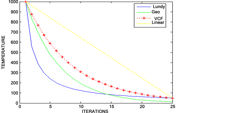 from the initial temperatures to the minimum temperature. Its rate of cooling is more preferred to the other three cooling schedules, which presupposes that the VCF will fit well into the SA algorithm.