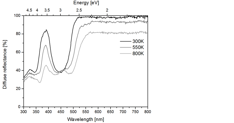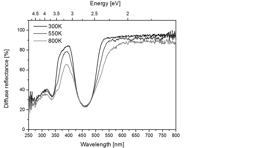 Figure 1. Diffuse reflection spectra of a Y3Al5O12:Ce3+ ceramic at 300, 550, and 800 K (at all temperatures BaSO4 was used as a white standard).