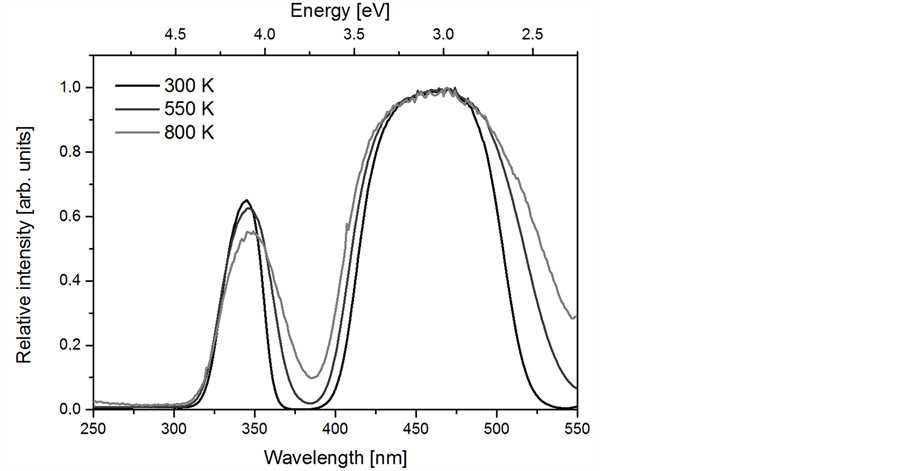 The normalized excitation spectra, as depicted in Figure 3 and Figure 4, of the YAG:Ce and LuAG:Ce ceramic were recorded in the same temperature range, viz. between 300 and 800 K, like the reflection spectra discussed above. The spectra show two excitation bands at 300 K which are as-signed to transitions to the two lowest energy levels of the five crystal field levels for a ligand field with D2 symmetry. The two bands, which are observed around 344 and 460 nm for YAG:Ce and about 350 and 450 nm for LuAG:Ce are assigned to the two lowest crystal-field components. These findings are in excellent agreement with the literature [7] . However, with increasing temperature up to 800 K two novel sidebands appear, which are attributed to the thermal population of the spin-orbit split sublevel 2F7/2. This population continuously increases with temperature as expected. This effect can be observed for YAG:Ce, but is much stronger for LuAG:Ce. We assume that this difference is caused by the larger spin-orbit coupling of the Ce3+ ground state level in LuAG in comparison to YAG.