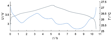One additional important investigation during aging processes is temperature behavior. As mentioned before, change in crystal structure is one important mechanism of aging a NCA-based Li-ion cell by cycling with small DOD. The phase change leads to a variation in lattice parameter and changes the order of the system. In this case the entropy of system is changed. The entropic effect has an impact on aging behavior of NCA-cathodes, because entropy change of solid materials leads in general to structural stresses. In order to determine entropic effects the change in temperature is the key factor [49] . The change in entropy in general could be positive or negative, which results in positive or negative temperature gradients in the cell.