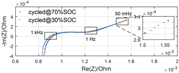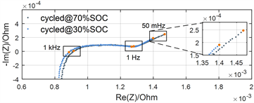 In Figure 3 the results of electrochemical impedance spectroscopy after 6000 partial cycle test at 70% SOC and 30% SOC from 6 kHz up to 50 mHz with current amplitude of 1 A and 36 points per decade are shown. In Figure 3(a) the results of EIS at 70% SOC where the dark grey dots after cycling at 70% SOC and the light blue dots after cycling at 30% SOC are illustrated.