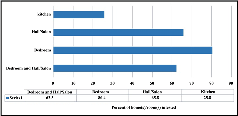 Overall, 80.4% (152/189) of the bedrooms, followed by 65.6% (124/189) of main hall/salon were observed to be infested (Figure 2), and they are the most potential risk-associated rooms or areas in the households. Since bedbugs hide in the cracks and crevices of walls and other materials like bed, chairs and couches, they emerge and get easy access to feed (bite) on the human at night. 15 If family size is quite bigger, all the family members cannot accommodate in the bedroom, rather some of them might prefer to sleep in the salon/main hall. These create an ideal situation for the infestation; consequently the bedrooms and salons are often infested than in any other rooms (Figure 1). Bedbugs are nocturnal feeders and will aggregate together in harbourages in close proximity to where their preferred host sleeps [15] .