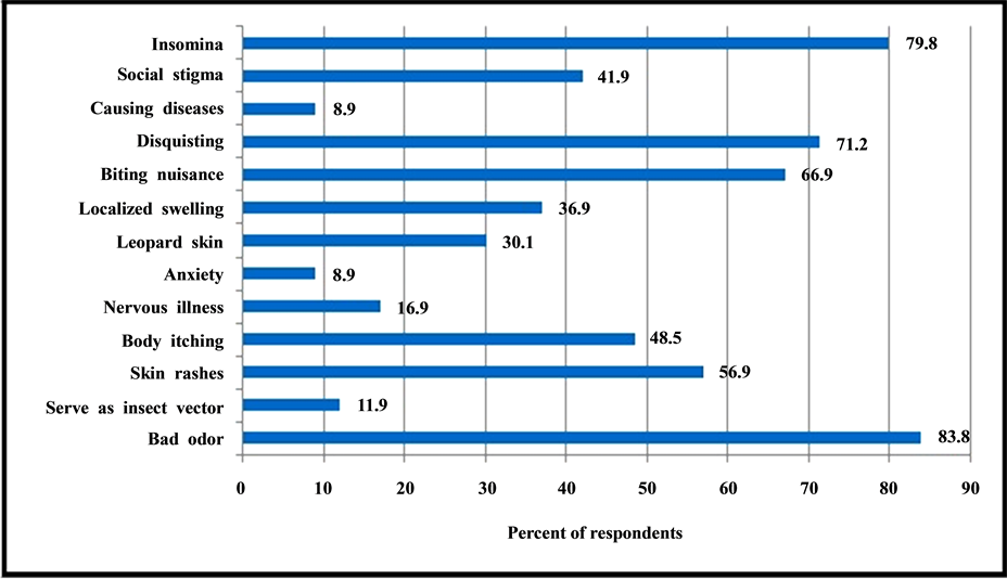 Due to the recent resurgence, it is extremely vital to understand the potential health risks associated with bedbug infestation [11] . The great majority of the respondents were worried because of a various adverse psycho-socio-economic-health consequences of infestation (Figure 2). A recent study reported that bedbug infestation causes serious social stigmatization and isolation too [16] . The majority of people consider that the persons with poor hygiene and low economic status might have infested [3] . Though bedbug bites are painless, it may cause severe reactions ranging from asymptomatic to itchy, swollen and blistered bites on exposed skin, sometimes resulting in secondary bacterial infections too [17] .