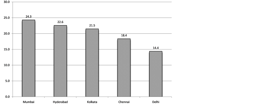 From Table 2, higher proportion of Mumbai and Kolkata slum households possess toilets with “Flush to piped sewer System” at the same time those who go for open defecation is also in higher proportion from these two cities. In general majority of the households are not having toilet facility and they mostly go for open defecation. About 11.4% of the households do not know where their toilet drainage is connected. “Other” category includes that Flush-don’t know where, Pit latrine-ventilated improved pit (VIP), Pit latrine-with slab, Pit latrine- without slab/open pit and dry toilet. There is a significant (P < 0. 001) difference in the observed proportion by each city. Proportions of the open defecation is compared [7] among the five cities it is found that Delhi and Hyderabad have similar proportions (P > 0.05) 75% to 79%, Kolkata and Chennai have parallel high proportion, that is more than 95% to 100% (P > 0.05) and Mumbai stand as medianper cent of 89.6.