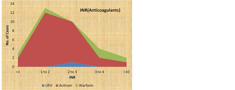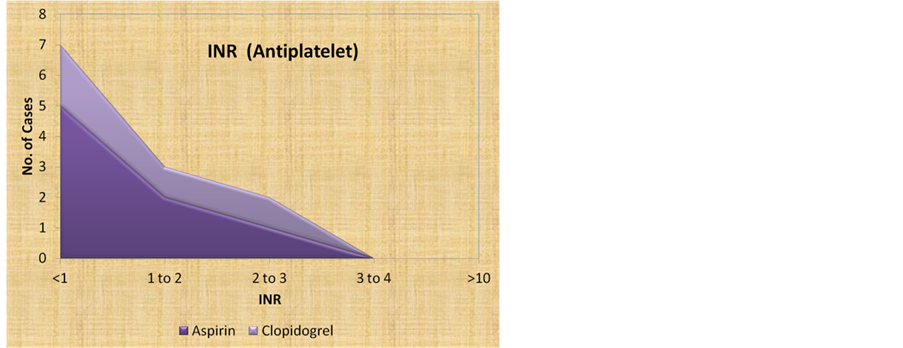 As per accepted norms the dose of the anticoagulants were adjusted in the therapeutic range so that the INR is maintained between 2 - 3. In this study 40.62% had INR in the range of 1 - 2 and 31.25% had INR in the range of 2 - 3. Two cases were seen with INR > 10. Excessive uterine bleeding is a revealed form of bleeding which should alert the treating physician to monitor INR. In such cases remedial measures can be instituted early before any other fatal bleeding occurs. The inception cohort, observational ISCOAT study [42] showed that the lowest rate of bleeding (4.8% pt/yr) was in the 2.0 - 2.9 INR category, where as the bleeding incidence increased exponentially for INR-values > 4.5. TRILOGY ACS [43] report declared in 2012 said that the newer anticoagulants like rivaroxaban and vorapaxar caused increased bleeding when given on top of aspirin and clopidogrel, but aspirin is probably the worst culprit here.