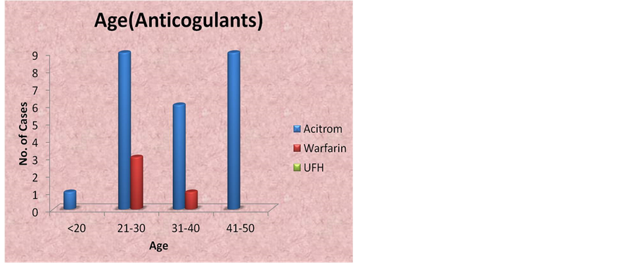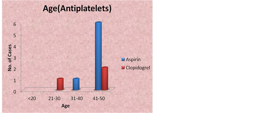 In this study out of the total 44 cases, 32 were on anticoagulants. The maximum cases were in the age group 21 - 30 yrs (40.6%). 28.12% were in the age group of 41 - 50, 21.8% in 31 - 40 yrs, 6.25% in 50 - 60 yrs. One case was 16 yrs and presented with menorrhagia. In this study out of the total 44 cases, 12 cases were on antiplatelet drugs. The maximum cases were in the age group 41 - 50 yrs (66.66%). 8.3% each in the age group of 21 - 30, 31 - 40 yrs, 50 - 60 yrs. One case was 78 yrs and presented with post menopausal spotting per vaginum (PV). Figure 2.