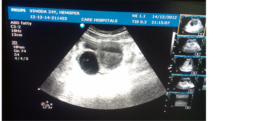 Three of the 7 complications occurred during the study period. Two cases had major intraperitoneal bleeding. One was due to rupture of corpus luteal cyst of ovary, she was found to have severe anaemia. She was given 2 PRBC transfusions and anticoagulants were stopped for 3 days. IV antibiotic coverage was given.Evaluated with serial daily ultrasound for monitoring of regression of intraperitoneal haemorrhage (Figure 3). And other case was due to rupture of haemorrhagic cyst of ovary. Both cases were noted to have increased INR. There was no menstrual complaint in both the cases. Both were treated by conservative measures.