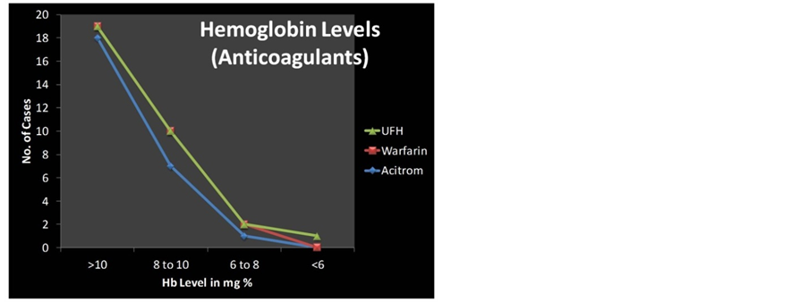 59.37% (19/32) of the cases had Hb > 10 gm%. 31.25% (10/32) cases had Hb between 8 - 10 gm%, 6.25 (2/32) between 6 - 8 gm%. One case (3.12%) had severe anaemia with Hb < 6 gm% in the anticoagulant users.