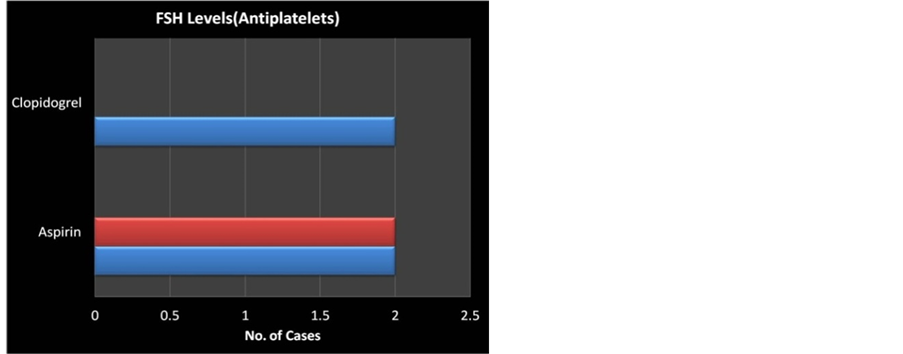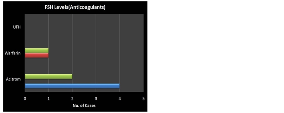 Serum FSH levels were estimated in 31.8% cases (14/44). 8 of the cases were anticoagulant users and 6 were using antiplatelet drugs. 12.5% (4/32) and 33.33 (4/12) had levels < 15, 3.12% (1/32) and 16.6% (2/12) of them in between 15-25, 3 cases of the anticoagulant users who had levels of >25 were noted to have amenorrhea in the subsequent months of follow up (Figure 5, Table 5).