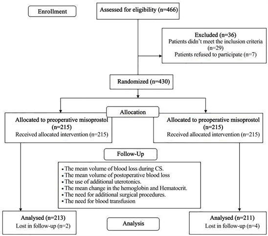 Four-hundred thirty women were randomized to both study groups (215 in each arm). In the end, six cases were excluded from the final analysis (two women from preoperative misoprostol group and four women from postoperative misoprostol group) due to failed spinal anesthesia or early discharge before completing the follow-up.