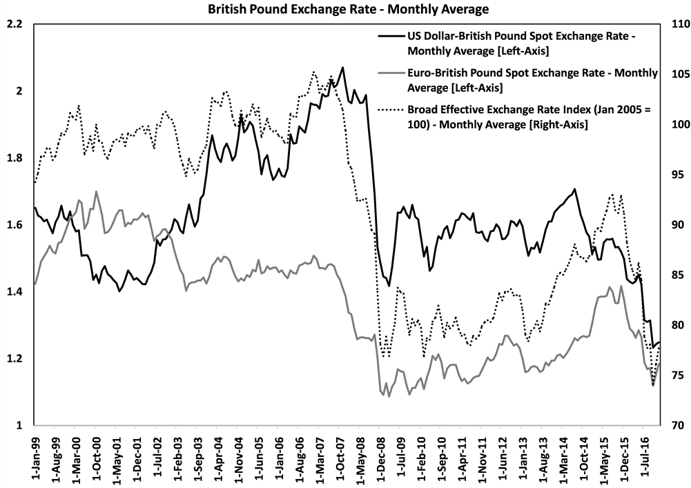 The impact of the sharp depreciation of British pound in the post-referendum period (and the likelihood of sustained pound weakness in the post-Brexit era) is highlighted in this study. As long as the decline in the value of the pound is orderly and not too drastic, the currency depreciation aspect might prove to be the one silver-lining in the whole Brexit saga. Some economists have argued that the UK had long suffered from an overvalued currency and a variant of the “Dutch Disease” phenomenon―in Britain’s case, it was the overreliance on finance (instead of commodities) that was responsible for economic distortions [22] . Sustained weakness in the pound will enable UK to reduce its dependence on the financial sector and lead to an improvement in its trade balance. Additionally, favorable valuation effects will help improve UK’s net foreign debt position (currency composition of UK’s external assets and external liabilities is such that a pound depreciation leads to an improvement in its net international investment position).